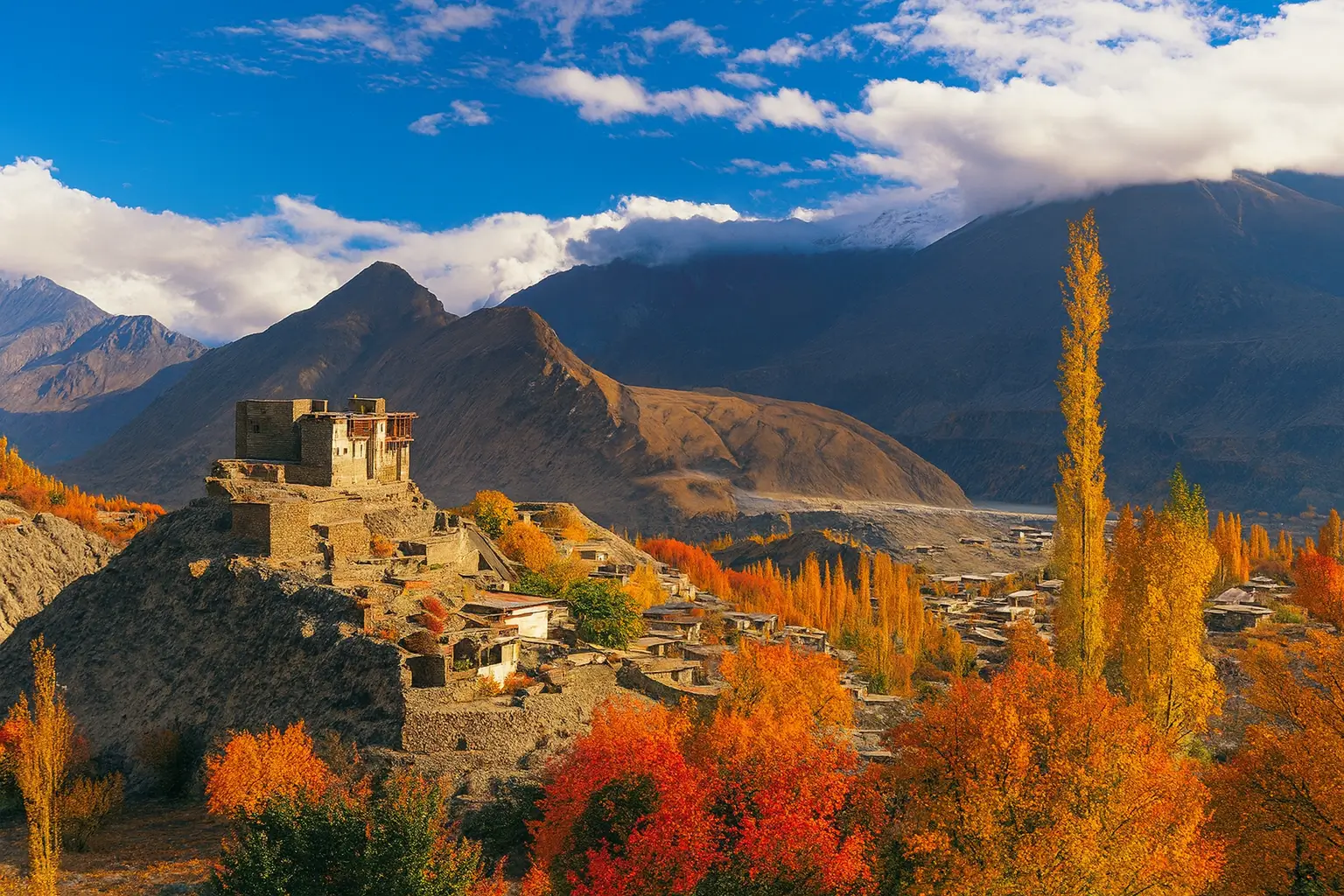 From here, the journey continues toward the iconic Hunza Valley, where the fall season turns every hillside into a warm palette of amber, yellow, red, and gold. The Karakoram peaks shine brilliantly above the glowing trees, creating some of the best autumn scenery in the world.