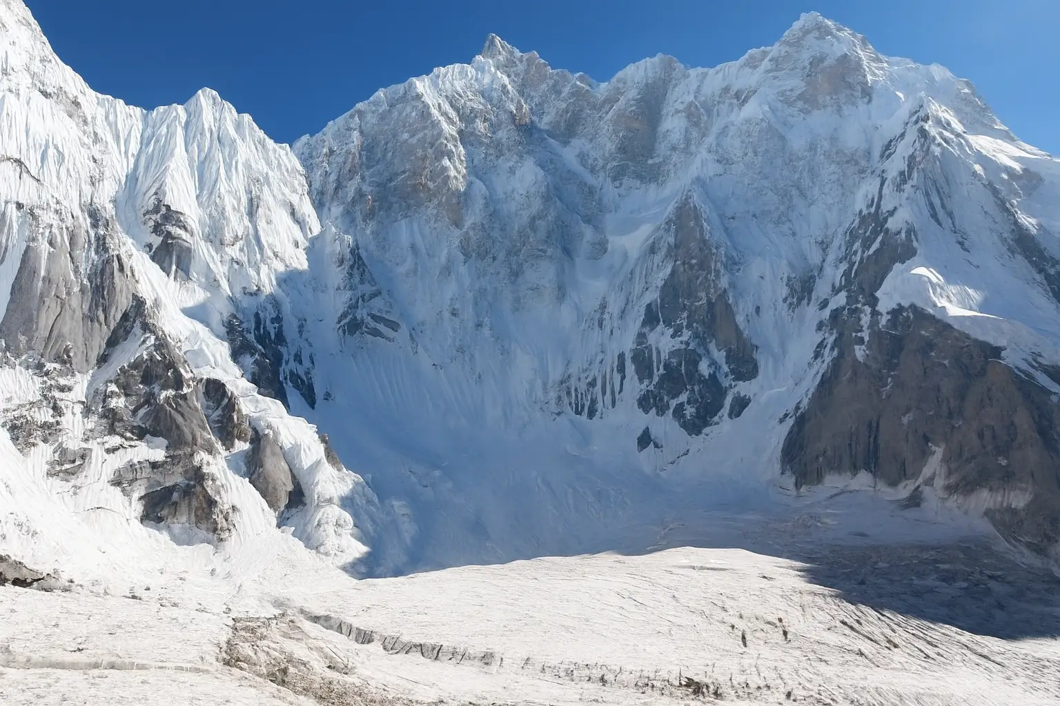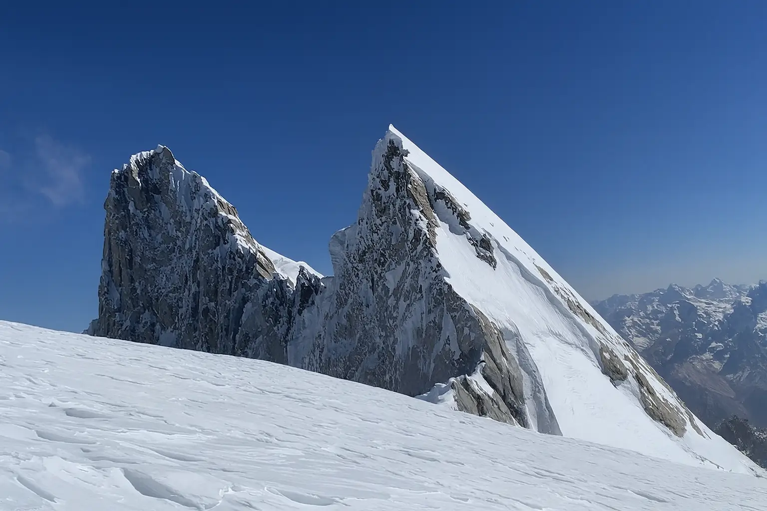 K6 (7,400 m), also called Baltistan Peak, is one of the most striking mountains in the Karakoram. Rising above Charakusa Glacier in the Hushe Valley, its steep pyramid shape dominates a landscape of granite spires and icy ridges.