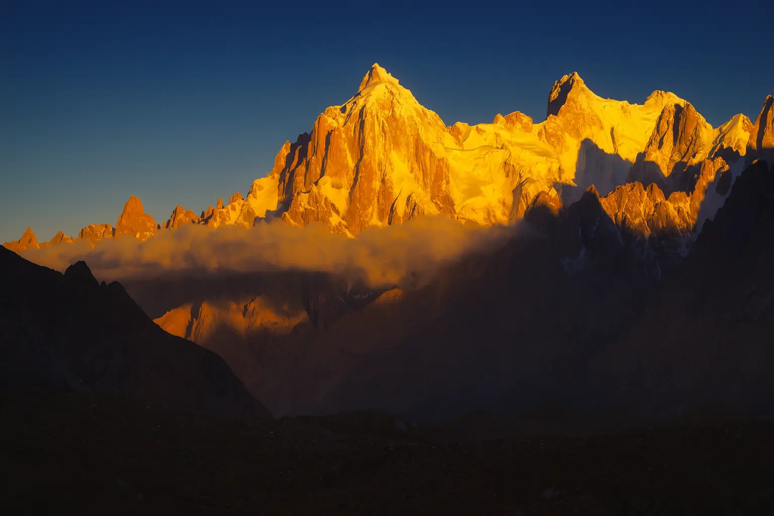 From its summit, climbers enjoy panoramic views of the Cathedral Towers, Trango Towers, Uli Biaho, Broad Peak, and the great Baltoro Glacier winding beneath them.